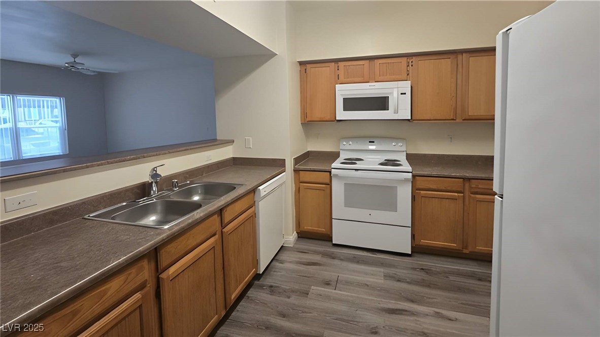 Price Improved to $228,800! Modern 2 BR, 2 BA in the Pinehurst—gated, clean, contemporary Southwest living, steps from 215 & Rainbow. Modern finishes meet practical living: upgraded laminate gray vinyl plank floors, open layout, and bedrooms positioned for privacy. Each suite includes a full bath. The kitchen flows seamlessly into a dedicated laundry room, while your living space opens to a covered patio—perfect for entertaining or morning coffee. Move-in ready with all appliances included (fridge, washer, dryer) plus covered parking. Gated community. Immaculate grounds. Turnkey living.